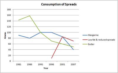 In sharp contrast to this, the consumption of low fat and reduced spreads did not even introduce until 1996, it then increased drastically until it dominated both butter and margarine in 2001 and then had a slight fall to finish at just under 80 grams, which is still the most popular spread in the year 2007.