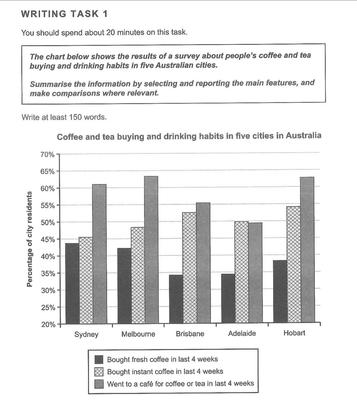 The given chart compares Australian residents’ habits in purchasing and consuming coffee and tea in five major cities in the past four weeks.